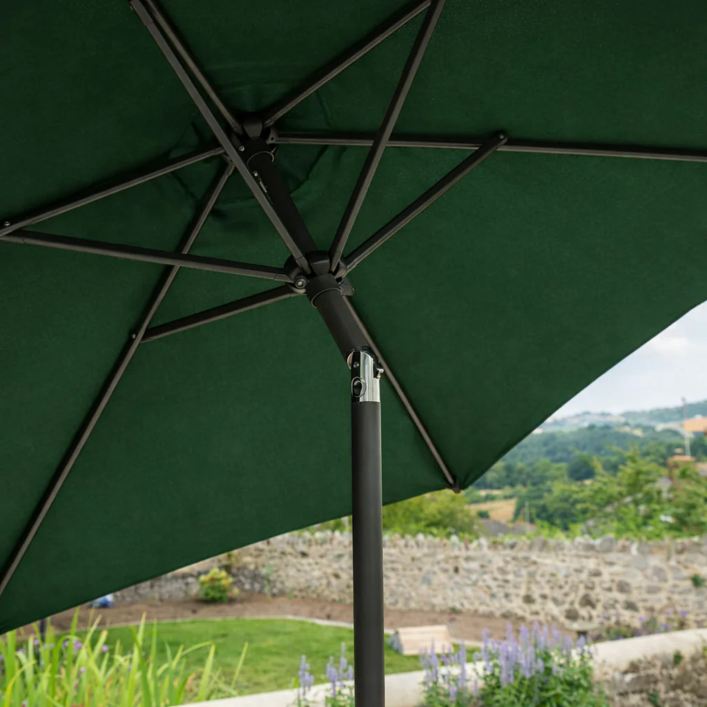 The rich green canopy adds a fresh, natural look that blends beautifully with lawns, plants and wooden garden furniture, making it a great choice for both traditional and contemporary outdoor settings. Opening the parasol is effortless thanks to the smooth crank handle mechanism, allowing you to raise and lower the canopy with ease. The convenient tilt function, operated by a quick-release pin, lets you adjust the angle throughout the day to maintain comfortable shade as the sun moves.