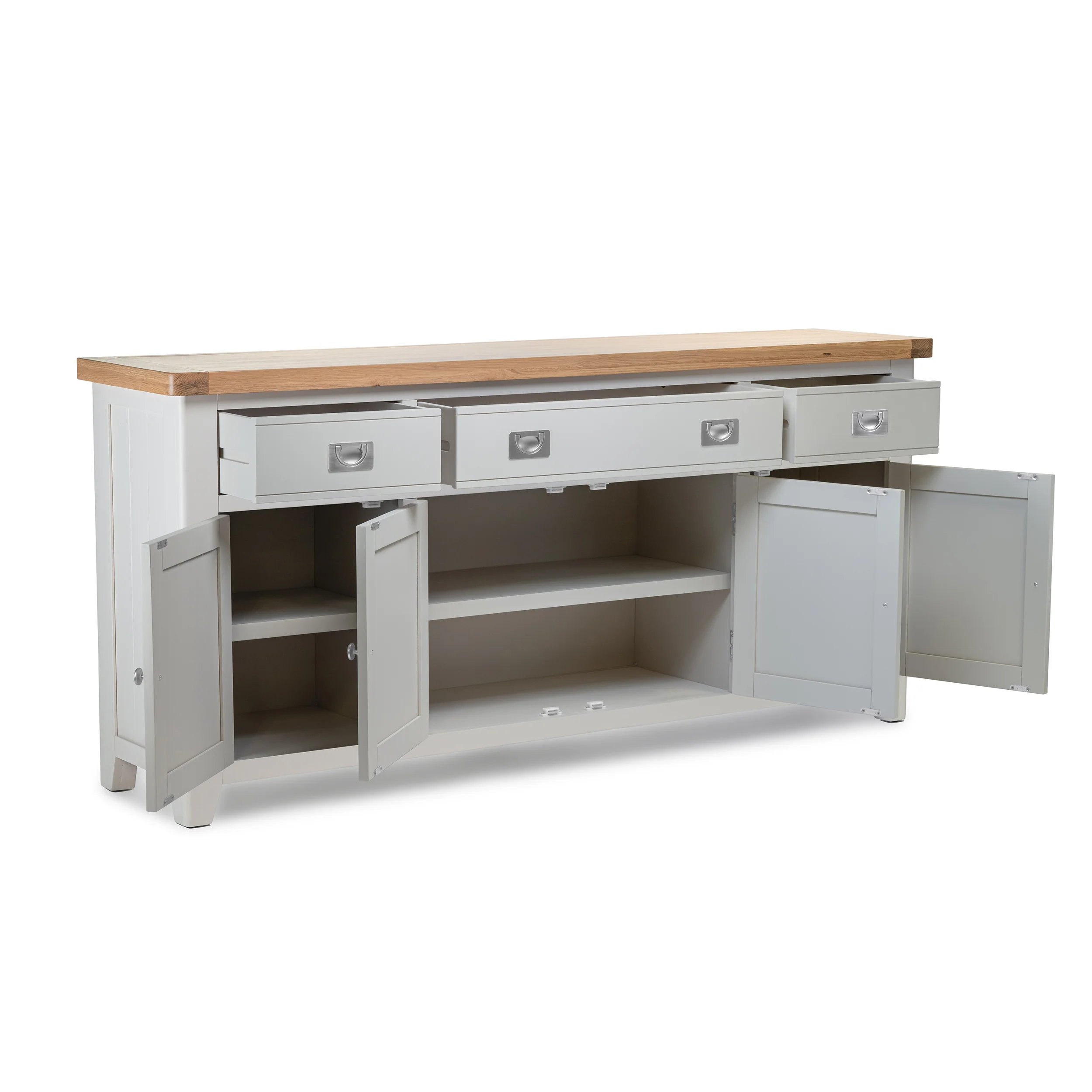 If you're looking for a stylish and practical way to keep your dining room, kitchen, or hallway tidy, this extra large sideboard might be exactly what you need. With three spacious drawers, each featuring a sleek flush pull handle, and four cupboards, there's plenty of room to store those larger items as well as all the necessities. The panelled design and grey painted finish give it a contemporary country look, while the natural oak top adds a touch of warmth and elegance. Plus, you can easily decorate the top with some of your favourite florals, scented candles or art work. Whether you're looking for extra storage or simply want to add a touch of style to your home, Gloucester grey extra large grey sideboards are the perfect choice.