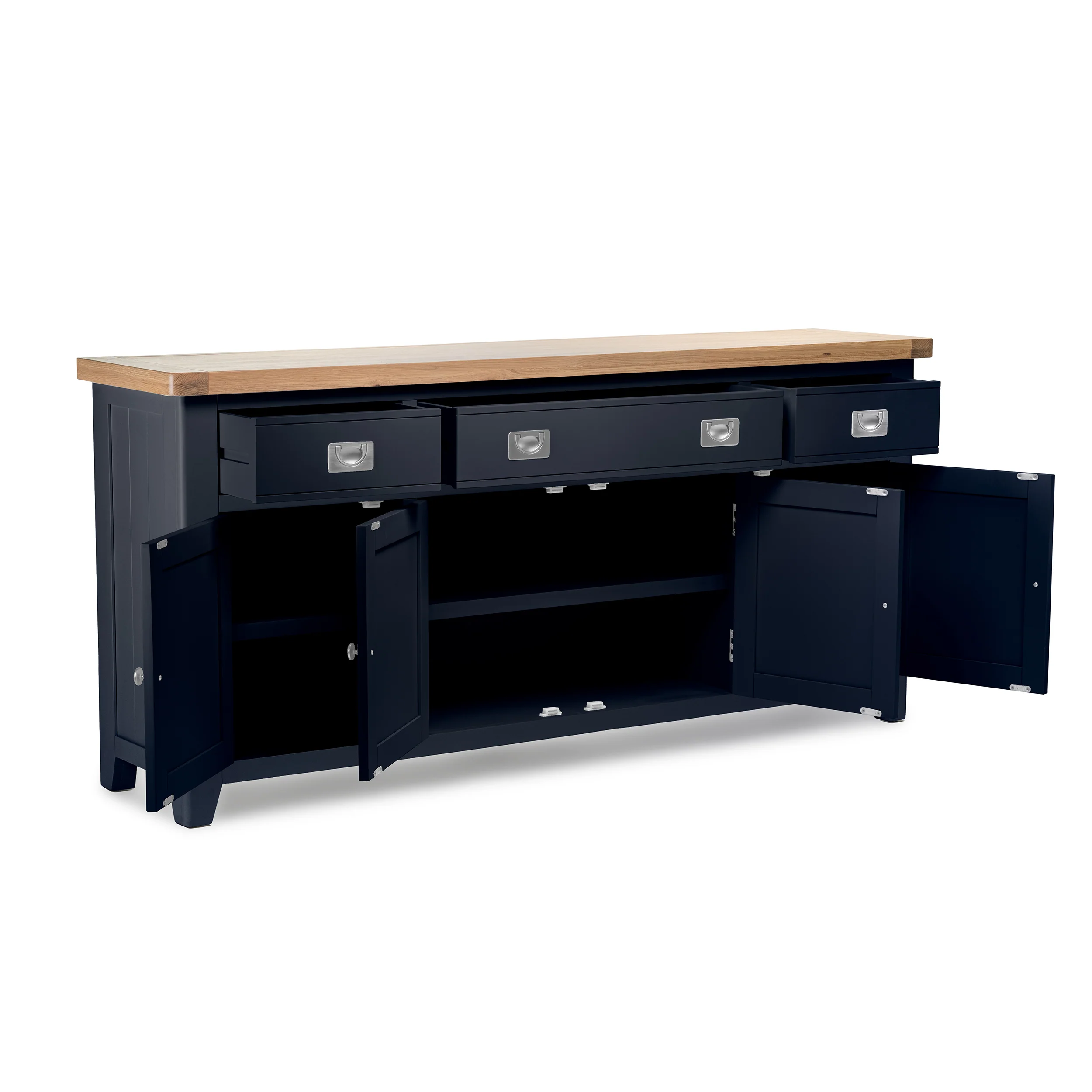 If you're looking for a stylish and practical way to keep your dining room, kitchen, or hallway tidy, this extra large sideboard might be exactly what you need. With three spacious drawers, each featuring a sleek flush pull handle, and four cupboards, there's plenty of room to store those larger items as well as all the necessities. The panelled design and deep blue painted finish give it a contemporary country look, while the natural oak top adds a touch of warmth and elegance. Plus, you can easily decorate the top with some of your favourite florals, scented candles or art work. Whether you're looking for extra storage or simply want to add a touch of style to your home, Gloucester railings extra large grey sideboards are the perfect choice.