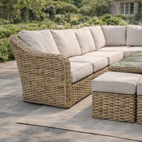 Create an outdoor space that feels every bit as considered as your interior with the Miami Garden Grande Corner Sofa Dining Set with Rising Table, Armchairs and Stools. Generous in scale and refined in detail, this statement collection is designed for those who love to gather, host and unwind in effortless comfort.