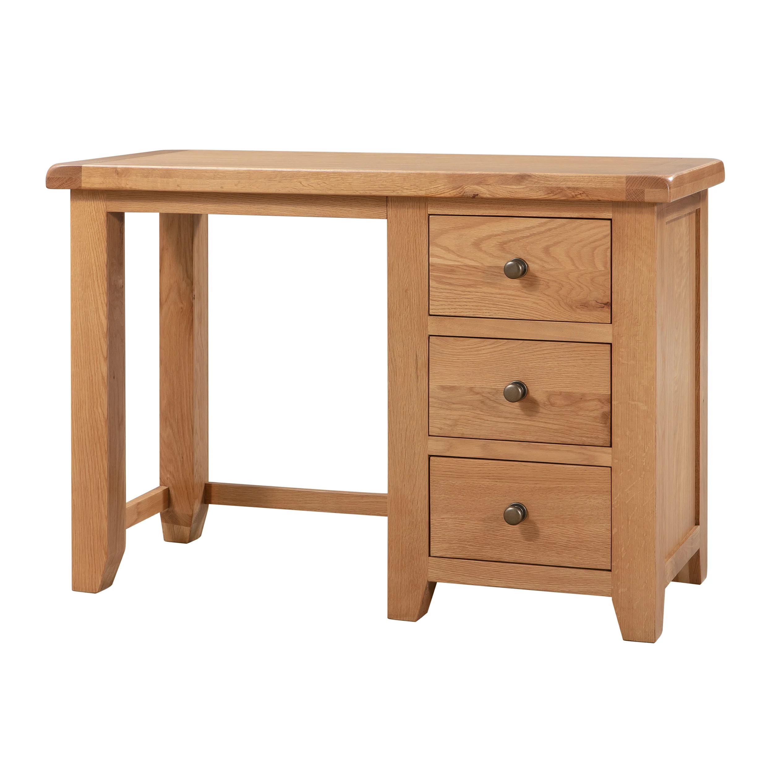 The Sussex Oak dressing table is a perfect example of good looks and functionality with its simple design making the most of all of its features. Built solidly by skilled craftsmen, the dressing table comes with three side drawers with bronzed knob handles, bringing you adequate space for all those personal essentials. Pair with the matching feature mirror and stool to create the ultimate styling area.