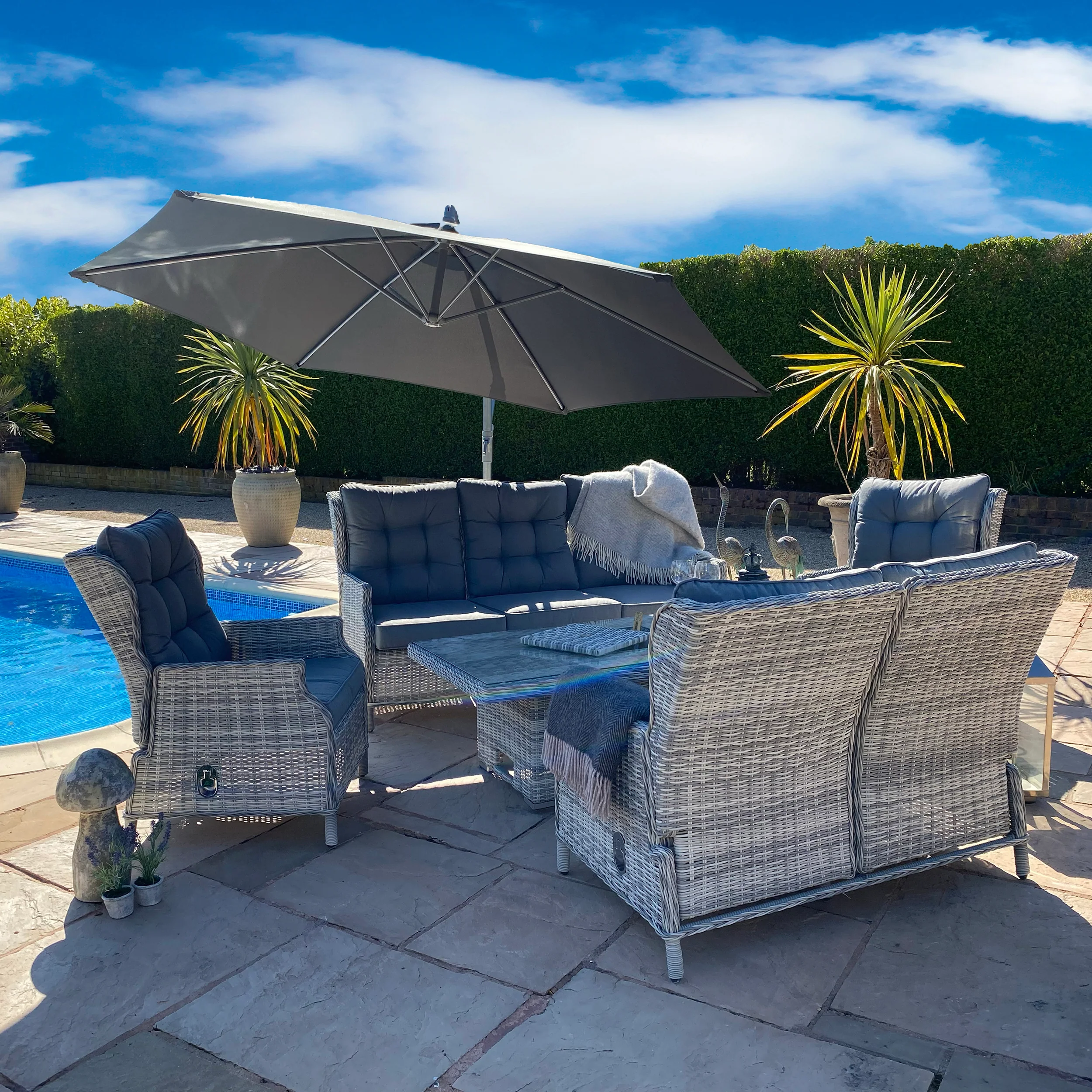 The stylish and modern design is finished in grey round rattan with matching grey cushions, finished on a powder coated aluminium frame. Remove the shower proof cushions and you can leave this set outside all year without a cover without any problems.