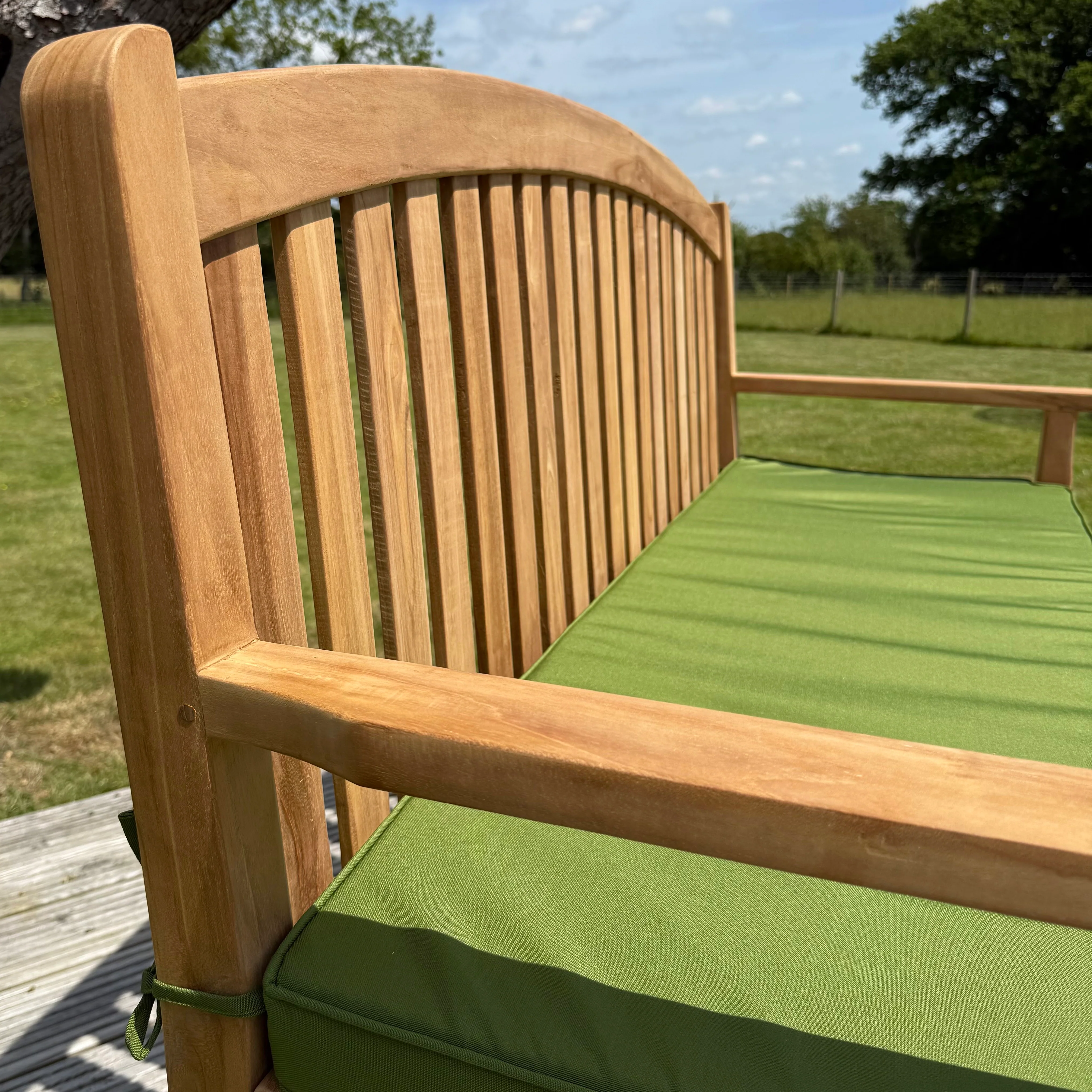 Elevate your outdoor space with the Windsor Large Teak Bow Back Garden Bench - a timeless piece designed to bring both style and comfort to your patio, decking or garden. Crafted from Teak wood, this bench not only boasts elegant, curved lines but also promises unmatched durability. Its naturally weather-resistant wood won’t peel, chip, splinter, crack, or decay, ensuring years of effortless beauty. Whether admired for its warm golden-brown tone or allowed to gracefully age into a silvery patina, this bench offers versatility - simply apply teak oil seasonally to maintain its original hue or customise it with your own finish. With a hand-sanded surface for a flawless touch and an ergonomic design featuring a contoured seat complete with a plush green seat cushion that invites long, relaxing afternoons outdoors and gently curved backrest, this bench is as inviting as it is enduring, turning outdoor moments into pure relaxation.